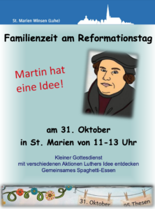 Am 31. Oktober von 11-13 Uhr sind alle Familien eingeladen zu einem bunten Vormittag rund um Luther im Gemeindehaus von St. Marien. Natürlich beginnen wir wieder mit einer kleinen Andacht und enden mit Spagetthi Essen.