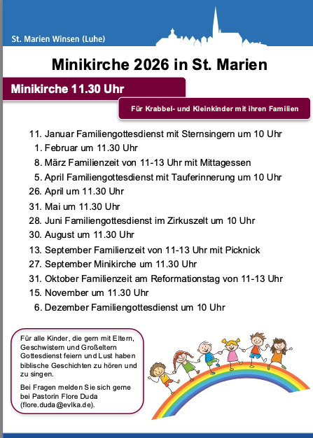 In St. Marien finden ungefähr einmal im Monat Gottesdienste für Familien und Kleinkinder statt. Bei der Minikirche wird gesungen, eine Geschichte erzählt und gebetet. Es gibt Lieder mit Bewegungen und Geschichten zum Mitmachen. Eingeladen sind alle Eltern und Großeltern mit ihren Kindern zwischen 0-6 Jahren.