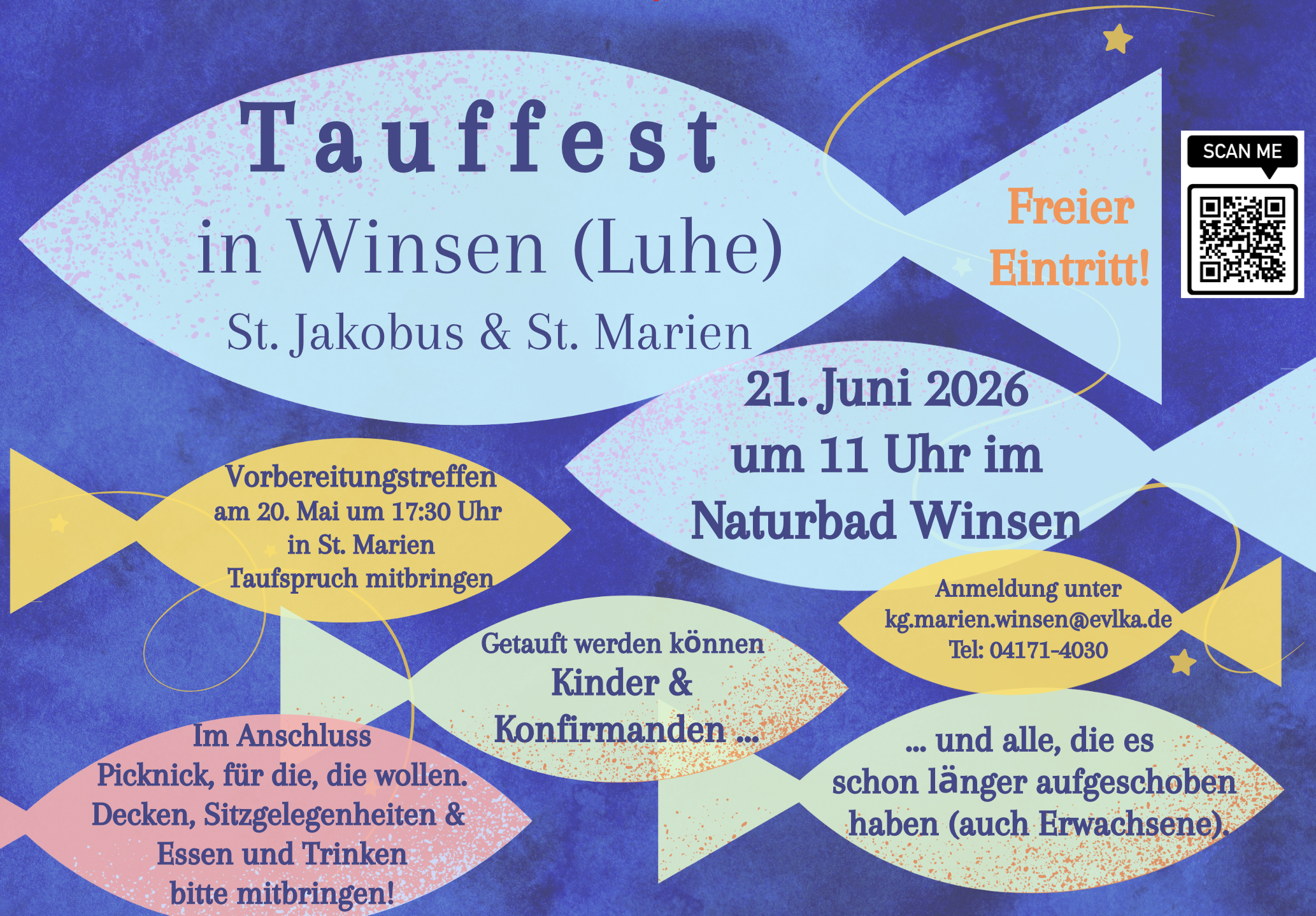 Die beiden Kirchengemeinden St. Jakobus und St. Marien laden zu einem gemeinsamen großen Tauffest in Winsen ein. Am Sonntag, den 21. Juni 2026 öffnen sich die Tore des neuen Naturbads im Eckermannpark in Winsen für einen Open Air-Gottesdienst mit Taufen am und im Naturbad. Im Anschluss an die Taufen ist Zeit für ein gemeinsames Picknick vor Ort. Der Taufgottesdienst beginnt um 11 Uhr.