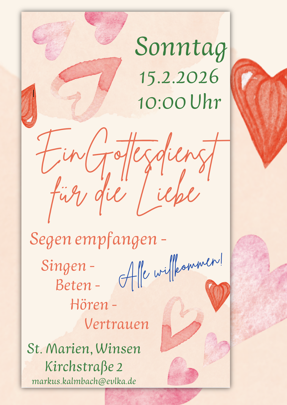 Am Sonntag, den 15. Februar, einen Tag nach dem Valentinstag bieten wir einen Gottesdienst für die Liebe an.