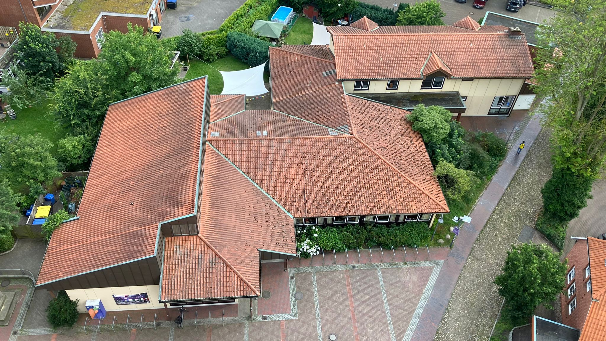 Der Blick auf das Gemeindehaus aus der Vogelperspektive: